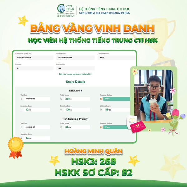 Quân từng lo lắng nhất là phần HSKK vì vốn nhút nhát, ít tự tin khi nói. Nhưng dưới sự giảng dạy tận tình của thầy Lê Minh Quang – giảng viên Tiếng Trung CTI HSK Cơ sở Lạng Sơn, em không chỉ vượt qua nỗi sợ mà còn đạt thành tích ấn tượng: HSK3: 268/300
